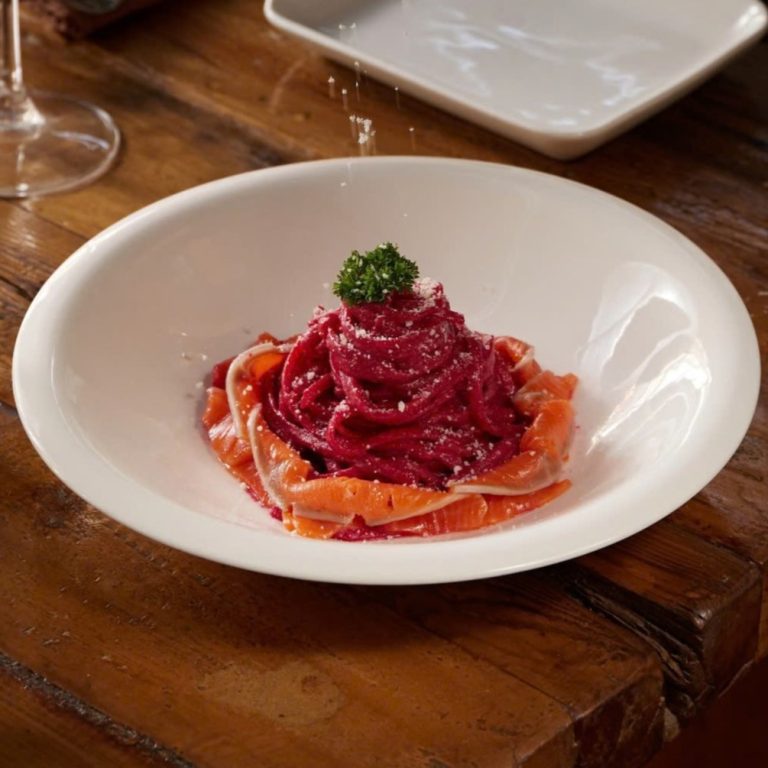 Salmon, spaghetti, beetroot sauce, parmesan